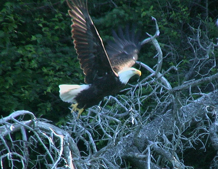 hohen Bäumen am Ufer. Er ist das Wappentier der USA. Seine Flügelspannweite