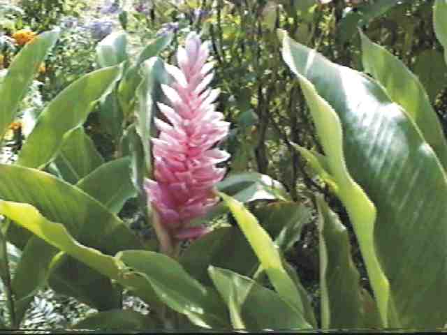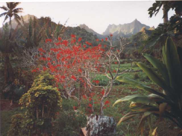 Bergen und zahlreichen tropischen Gewächsen, wie diesen orangerot blühenden