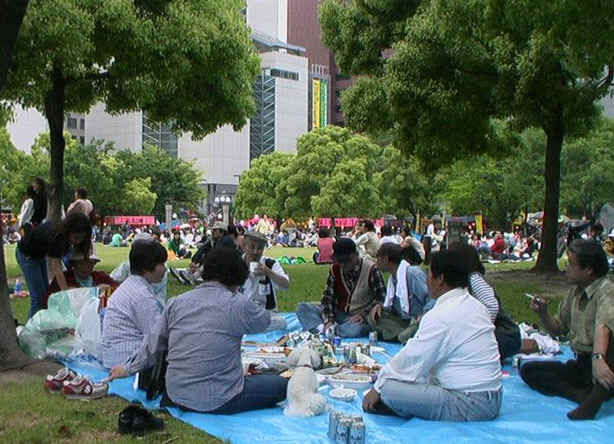 Diese blauen Plastikplanen sind allgegenwärtig, wenn Japaner unter freiem