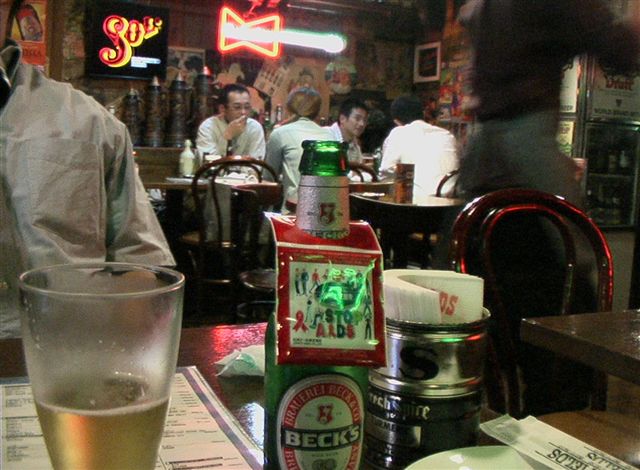 Das Bier in der Kneipe im Vergnügungsviertel Nakasu gibt es gleich zusammen mit einem Aids-Schutz. Wohl