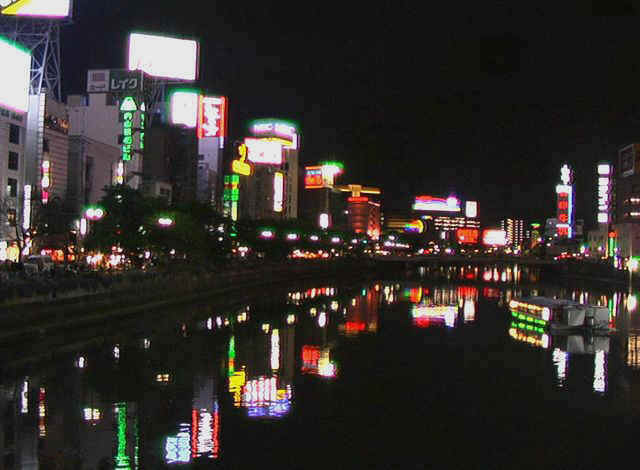 Die Naka-Fluß-Promenade wird in zuckendes Neonlicht getaucht, das sich im