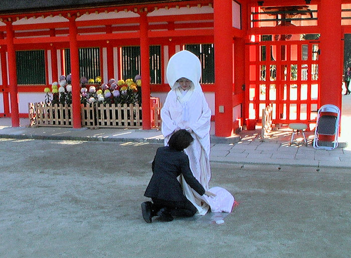 Der Bräutigam kniet vor der Braut, eine schintoistische Hochzeitszeremonie.