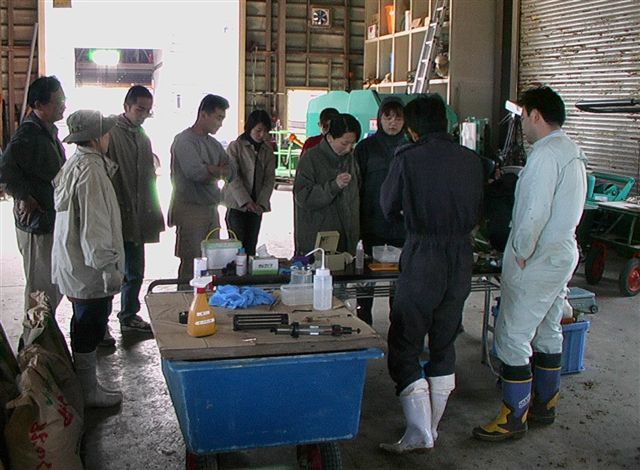 Die japanischen Kollegen lernen mit dem Schußbiopsiegerät umzugehen, das ich