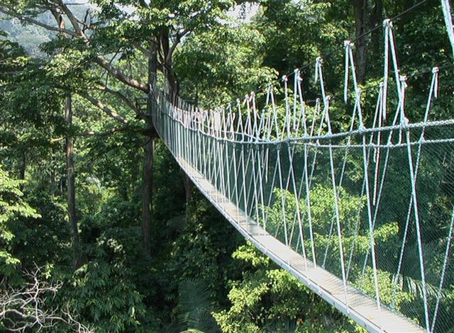 auf einer Hängebrücke hoch in den Wipfeln der Urwaldriesen spazieren kann.