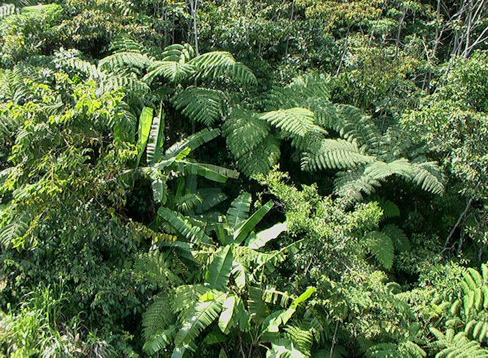 Dschungelbilder mit Baumfarnen und Bananenstauden am Berghang.
