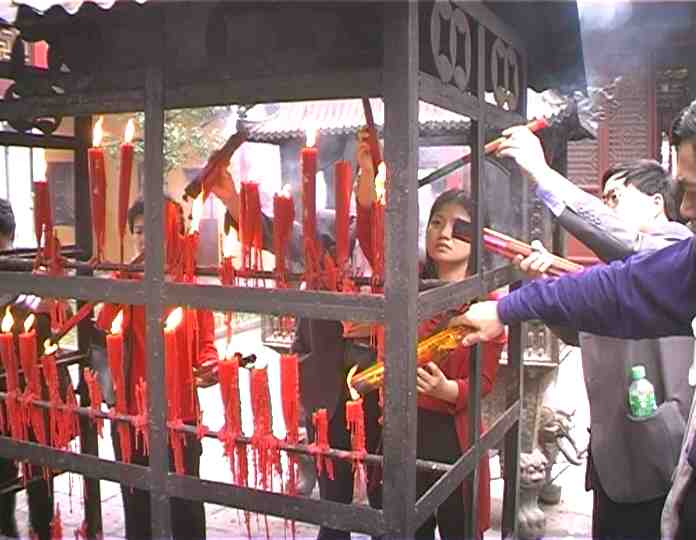 Der Tempel ist nicht etwa nur Museum, sondern hier werden Räucherstäbchen
