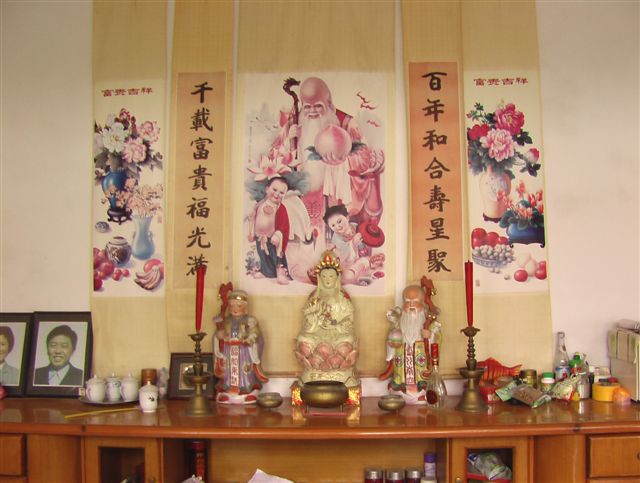 Hier finden sich Kerzen, Räucherstäbchen und die Bilder der Vorfahren, die