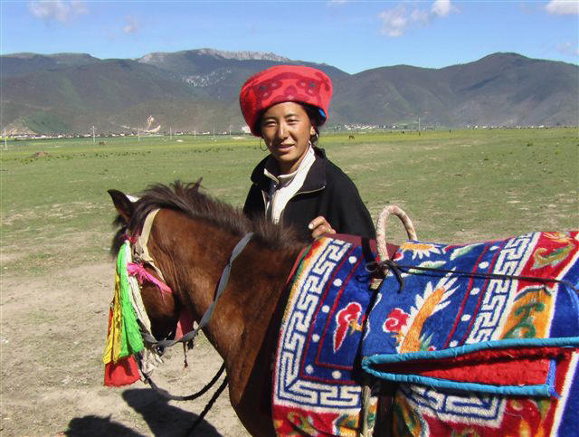 Die Mädchen tragen noch die pinkfarbene Kopfbedeckung der Tibeter und