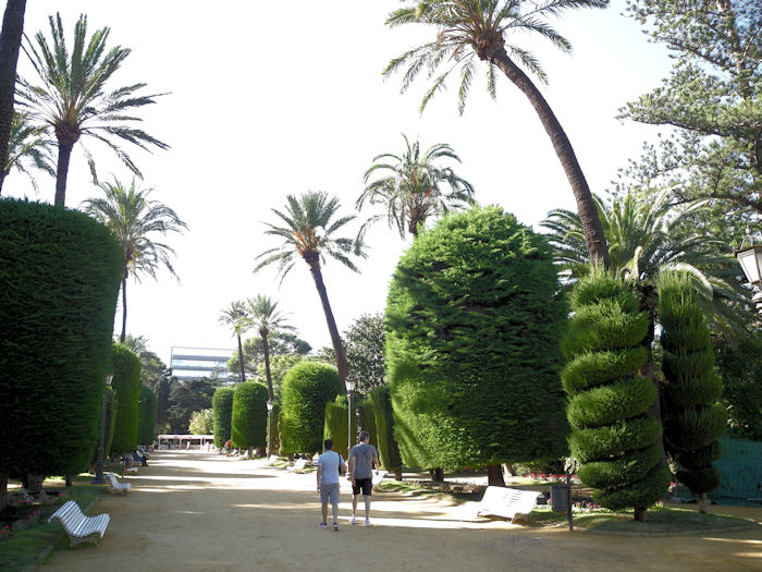 Kunstvoll geschnittene Bäume weisen den Weg im Park Genoves.