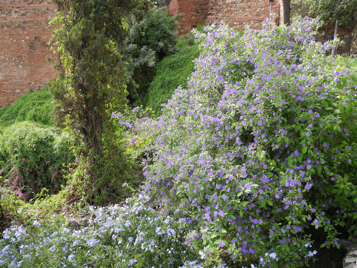 An der Festung Gibralfaro blühten riesige Büsche von Bleiwurz, Bourgainvillea