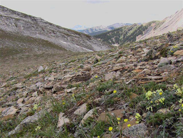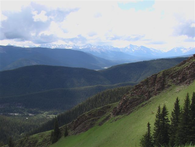 Wiesen bei 1900 m. Die Willmore Berge im Norden und die Moosehorn Berge im