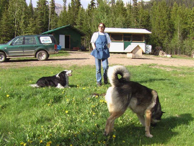 Laura mit ihren Hunden, ihrem Jeep und ihrer Schlaf-Hütte. Daneben
